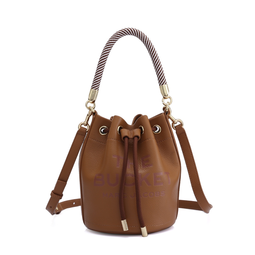 Introducing the elegant Otter Brown The Bucket Bag by Marc Jacobs. Crafted from premium leather, this stylish bag features a chic, minimalist design with bold branding. Its distinctive bucket shape and a versatile striped rope handle add an extra layer of sophistication. Perfect for everyday wear, this bag is designed to elevate any outfit.